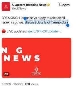In a dramatic development, Hamas announced Friday that it would agree to release all Israeli captives, living and deceased, under the framework of U.S. President Donald Trump’s peace proposal for Gaza. Politico+3Reuters+3AP News+3