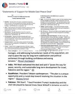 President Donald Trump took to Truth Social to announce a groundbreaking wave of international support for his proposed Middle East Peace Deal, aimed at resolving the Israeli-Palestinian conflict. In a detailed post, Trump listed endorsements from a diverse array of nations and entities, including Australia, China, New Zealand, the EU Commission, European Council, France, Germany, Italy, Russia, Spain, Turkey, the UK, a joint statement from Arab/Muslim leaders, Israel’s Finance Minister Bezalel Smotrich, opposition politician Benny Gantz, Lebanon, the Palestinian Authority, Azerbaijan, India, Kazakhstan, Pakistan, Canada, and Mexico. The post, accompanied by images of world leaders and a map highlighting supporting countries, described the deal as “eternal peace in the Middle East” that exceeds expectations.