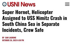 South China Sea – Two U.S. Navy aircraft from the USS Nimitz carrier strike group crashed in the South China Sea on October 26, 2025, in separate incidents just 30 minutes apart during routine operations, but all crew members were recovered alive with no serious injuries.