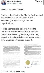 Tallahassee, Fla. – Florida Gov. Ron DeSantis announced on December 9, 2025, that the state has designated the Council on American-Islamic Relations (CAIR) and the Muslim Brotherhood as foreign terrorist organizations, effective immediately. The executive order directs Florida agencies to prevent these groups and their supporters from receiving state contracts, employment, or funds, mirroring a similar move by Texas Gov. Greg Abbott last month.