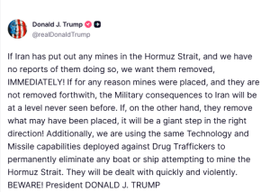 He framed the warning as a protective gesture toward China and other major oil importers reliant on the Strait, which handles ~20–21 million barrels per day (roughly one-fifth of global seaborne oil trade). “This is a gift from the United States of America to China, and all of those Nations that heavily use the Hormuz Strait,” Trump added. “Hopefully, it is a gesture that will be greatly appreciated.”