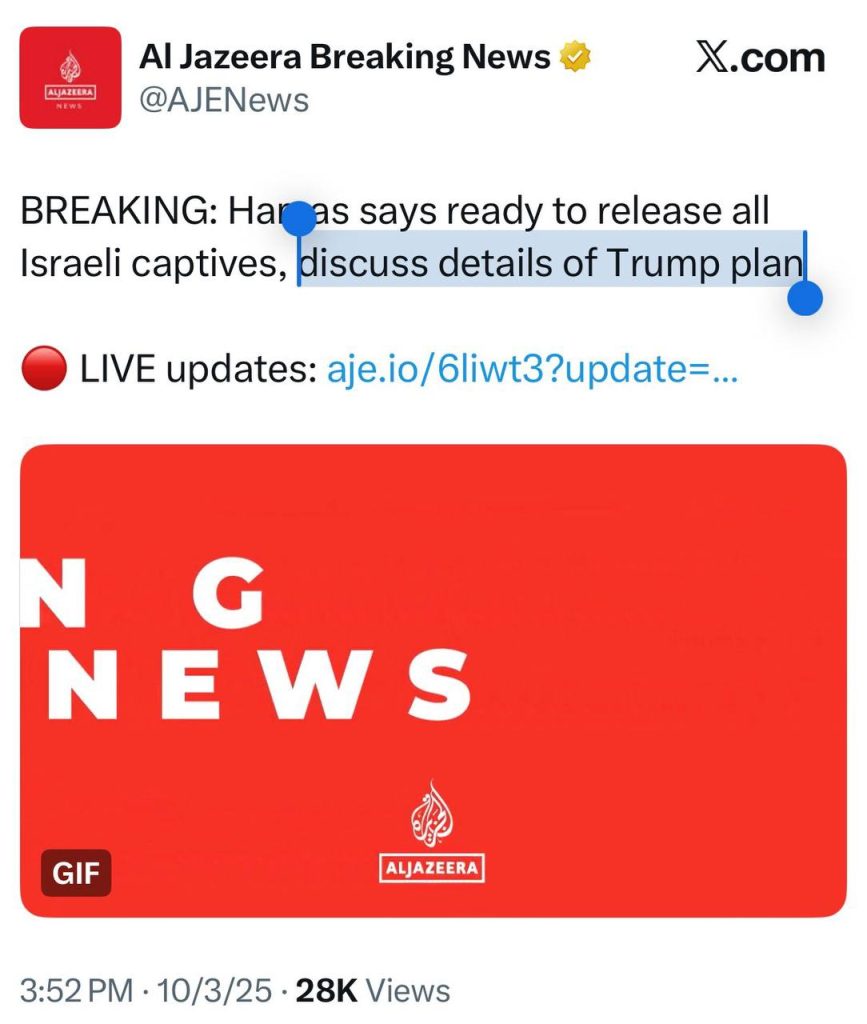 Hamas Says It Agrees to Release All Israeli Captives Under Trump Plan