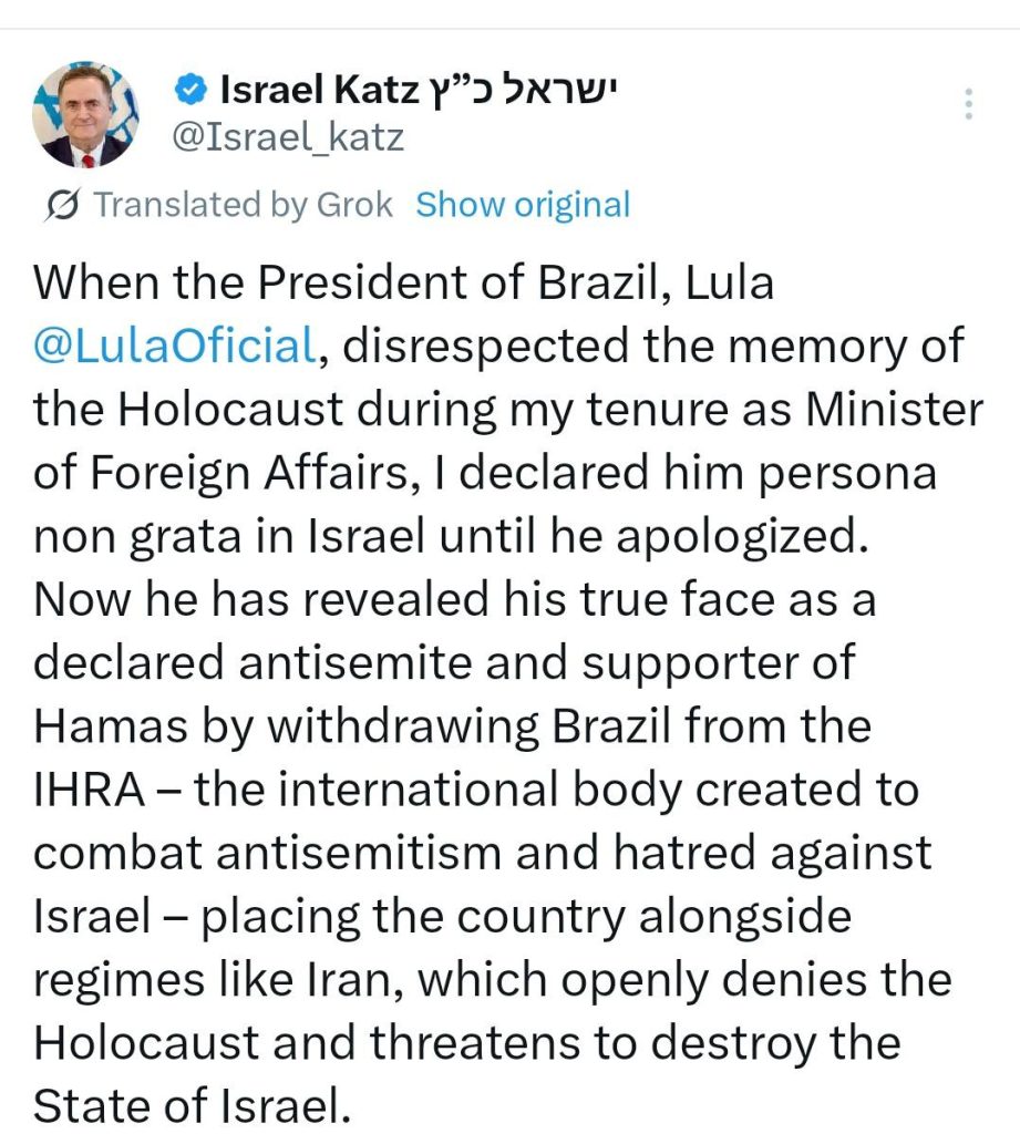 Israel’s Katz Slams Brazil’s Lula as Antisemite and Hamas Backer